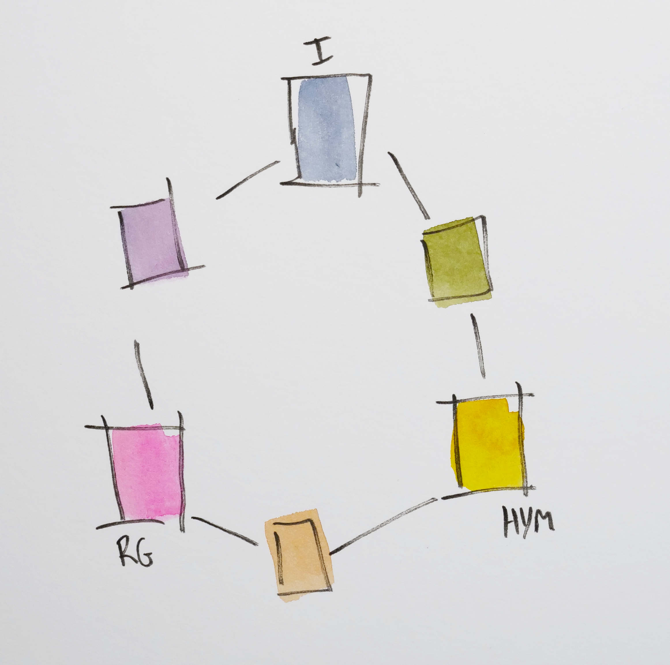 Hansa Yellow Medium + Indigo + Rhodonite – Moody, muted wheel with some pastel feeling secondaries.