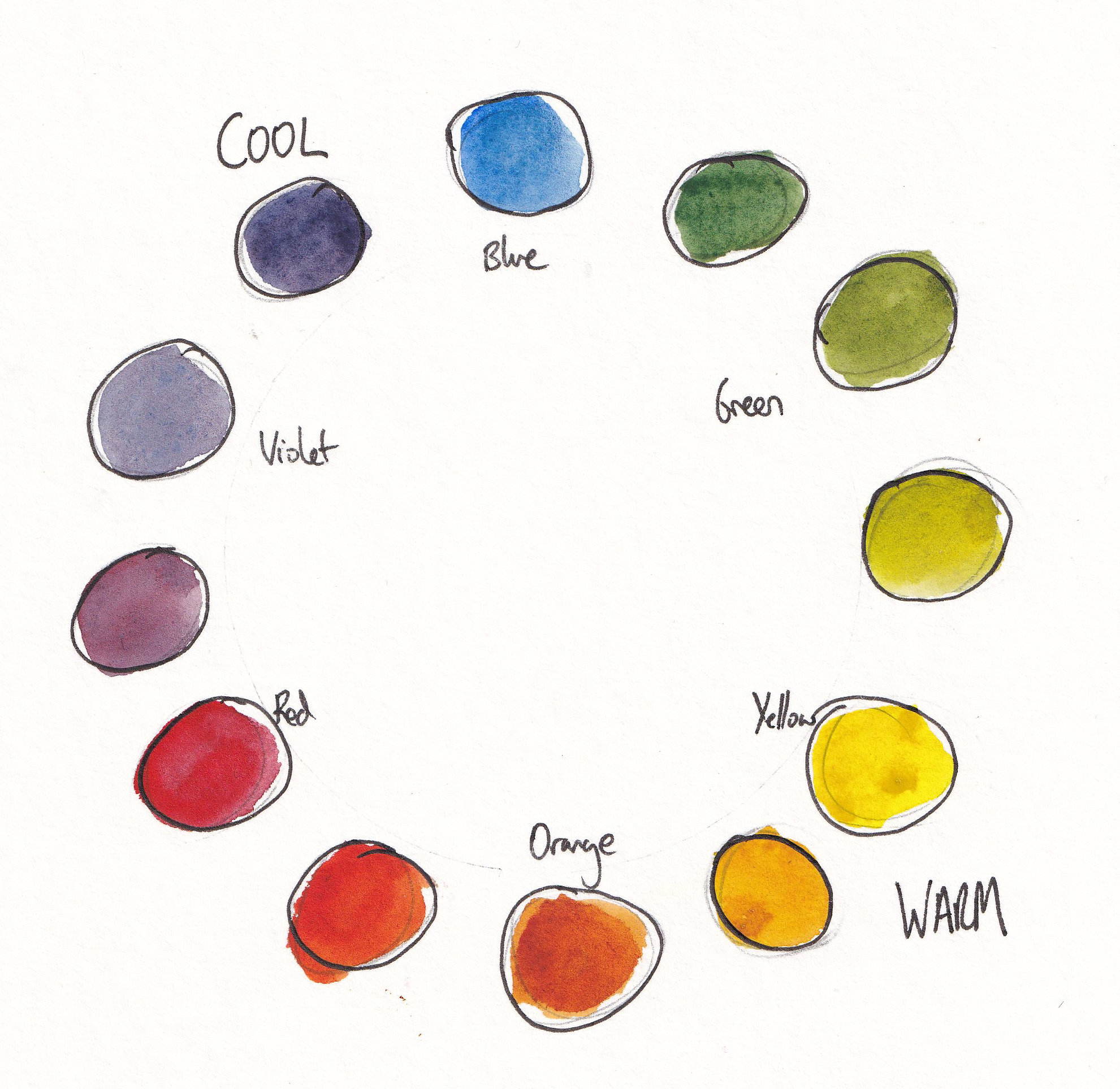 Warm colours include reds, oranges, and yellow-golds. In my palette: Pyrol Scarlet, Organic Vermilion, and Hansa Yellow Medium lean warm.