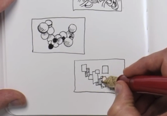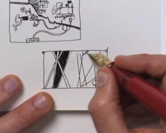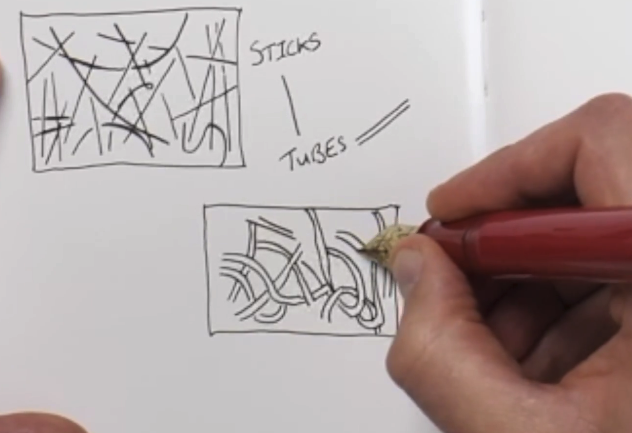 Leaving gaps when you first start to drawn enables you to slowly build up the ideas here, rather than have a creative vision at the start. Notice, in both the sticks and the tubes how there are lots of incomplete marks. These can be finished later... or not at all.