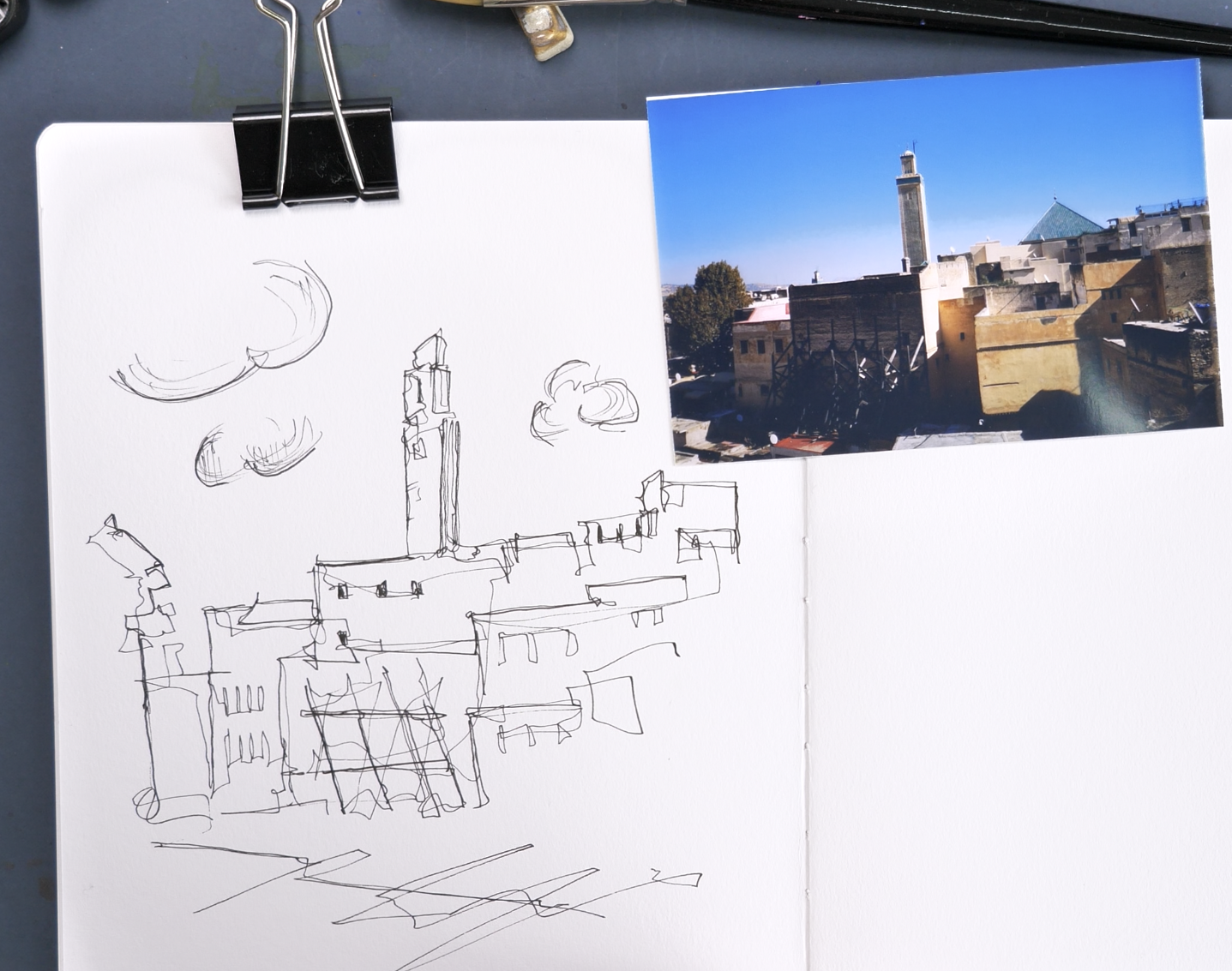 Look at your reference, but do not look at your page. Draw the scene slowly, letting your eye trace the shapes and your hand follow—without lifting your pen if possible. Don’t worry about the result. It’s not meant to be accurate. It’s meant to wake up your “seeing brain.”