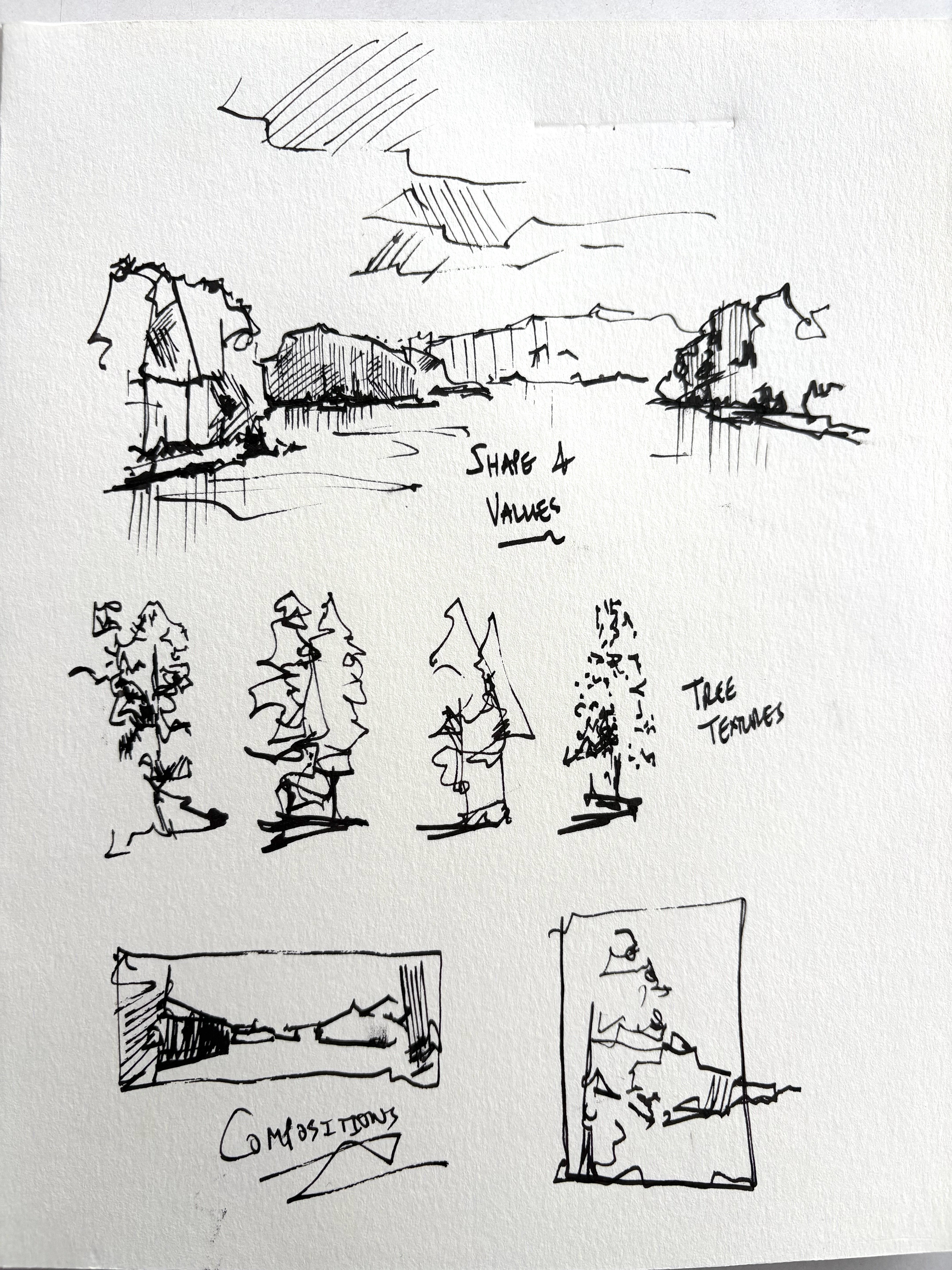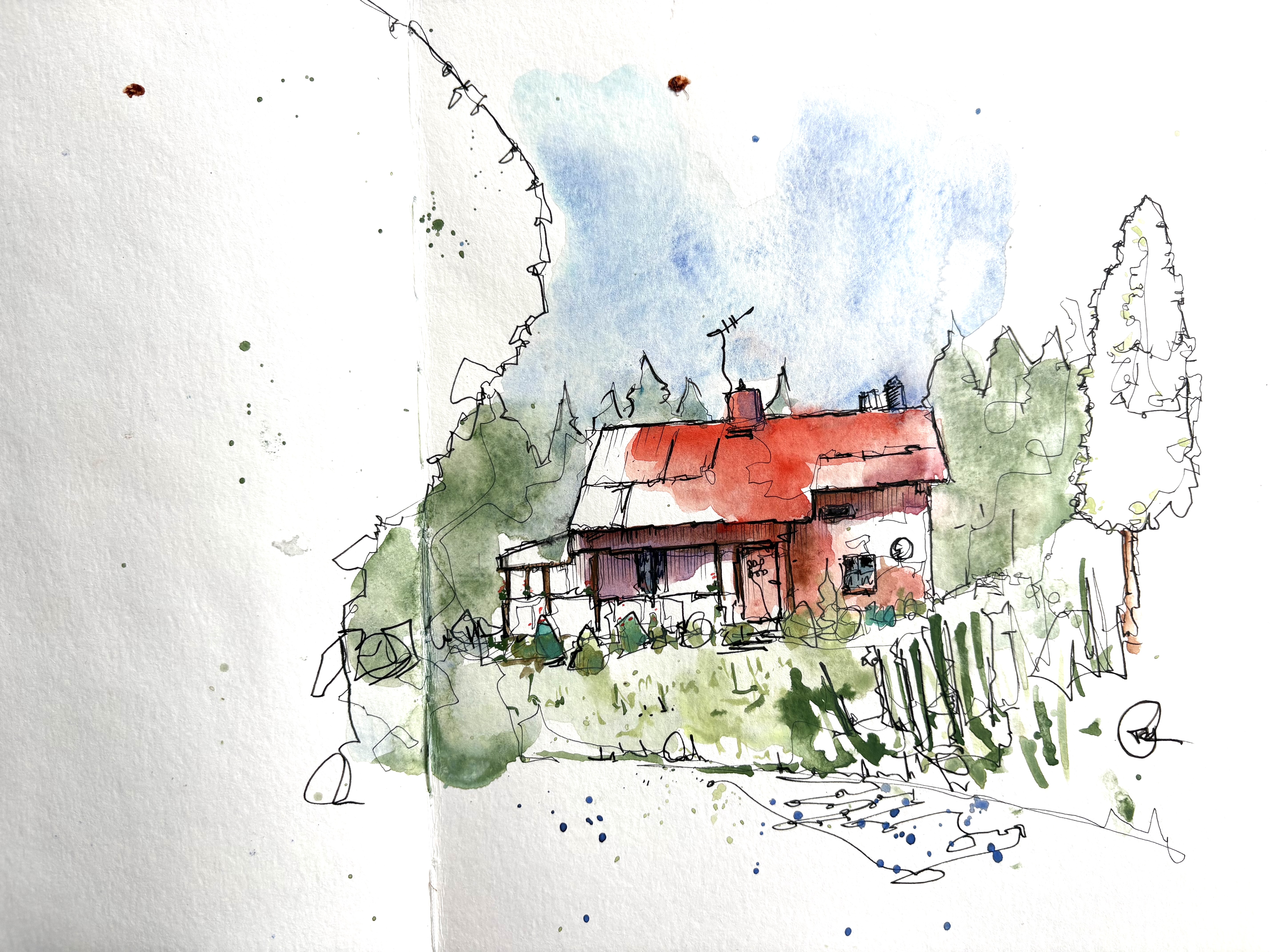 Being in Sweden has also been perfect for adding some visual variety - different buildings, trees, skies. I didn’t want this course to just be the same views over and over again. And some of workshop two, which is all about creative ideas to play with outside, will be sourced from here. For example, the sketches below will be turned into a dramatic inky landscape in a technique I call 'outside-inside sketching'!
