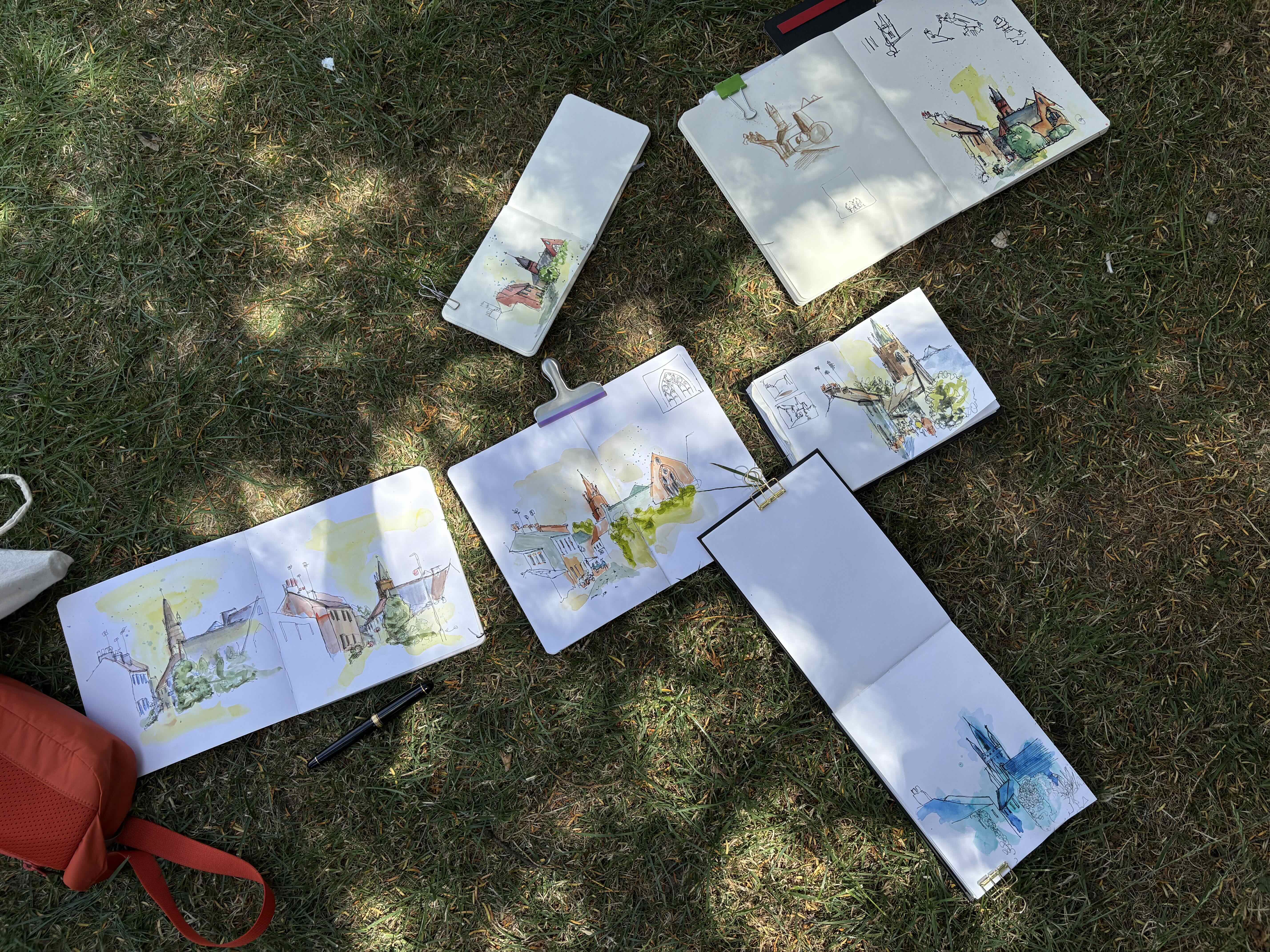First up, we headed out to warm up. I demonstrated a single-line sketch using a water-soluble pencil, and everyone jumped in. There was a little hesitation at first, but once the water hit the page, things came to life. That initial scene turned out to be perfect, so we stayed put for a couple of hours, glazing a light wash of yellow over everything. It sounds like madness, but by the end, the sketches were vivid and fascinating. The sketchbook throw down at the end said it all.