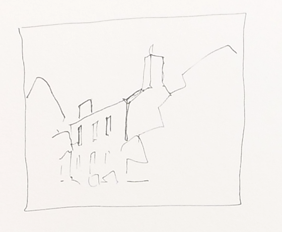 The first step of ink sketching is simply to find your shapes – don’t worry about being clever, just find simple shapes in your scene. It won’t look like much yet, but this is the foundations of pretty much any art.