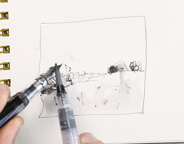 Finally, we can actually use of brush on our pen to create little ink splatters for textures, and then also pick ink up from the pen and use it to ‘paint’ with to darken some of the shadows.