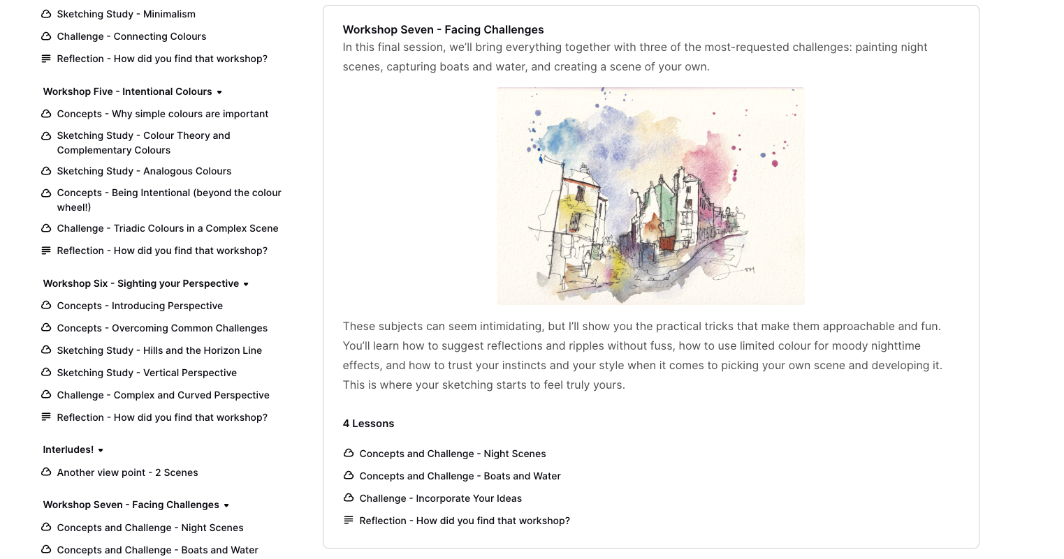 After this launch, I’ll be working on some shorter courses—think of them as sketching “add-on workshops.” These will dive into specific topics like watercolour, ink, or line work. Smaller, focused, and great for topping up your skills.